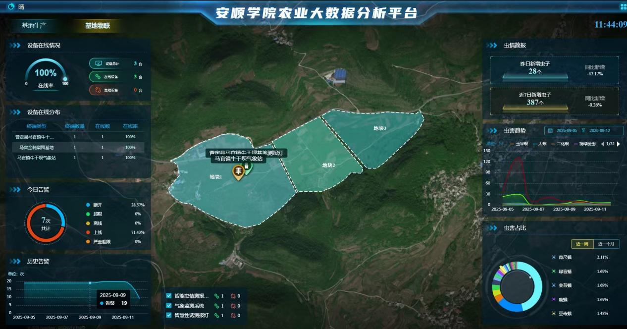农学院黔中特色高效农业植保信息化团队在普定县马官牛干坝金刺梨种植基地,对有害生物预警智能监测站进行了全面智慧化升级。学院投入专项资金,新增智能气象站、土壤墒情监测仪、虫情智能测报灯、智能性诱捕器及苗情远程监控系统等先进设备。