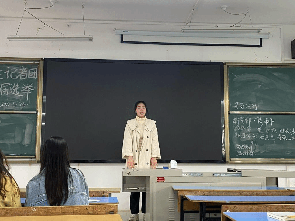 曾荟宇就目前记者团团内新添的部门及其相应的工作进行简单的介绍。干部换届以各位竞选人员轮流进行自主发言,线上投票方式进行。最后会议成功选举出了曾荟宇、袁宇、何春阳等同学为2022年度记者团的新晋团干。同时,新旧团干进行了工作的交接。