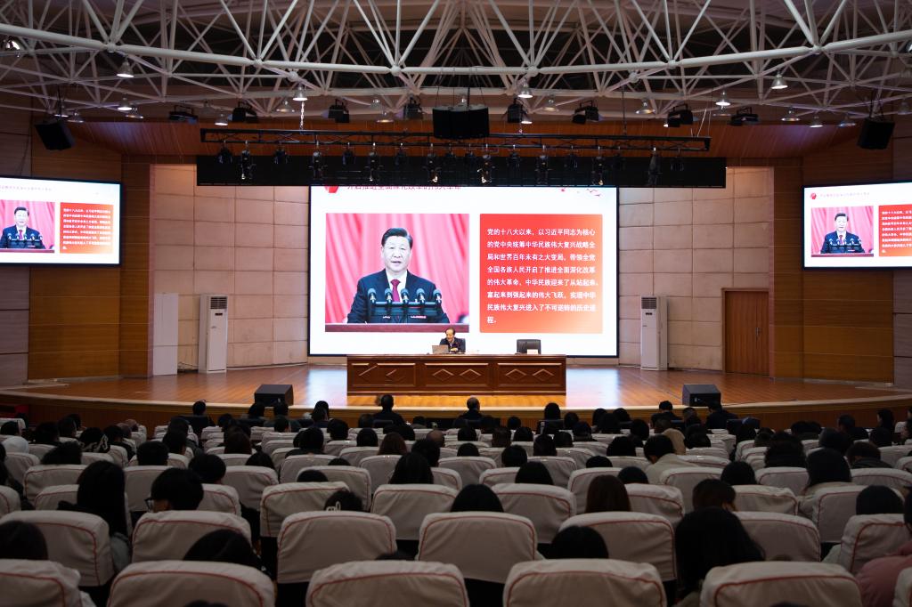 校长曾丽,党委委员、纪委书记、监察专员蔡红英,党委委员、副校长韦英,党委委员、副校长殷红敏,以及各职能部门负责人、师生代表共800余人聆听学习。(文/图:学生记者 吴梓均/吴梓均、王镱霖)