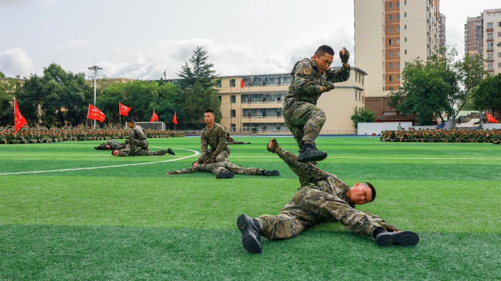 承训教官进行精彩的擒敌和队列示范。会场掌声阵阵,气氛热烈。