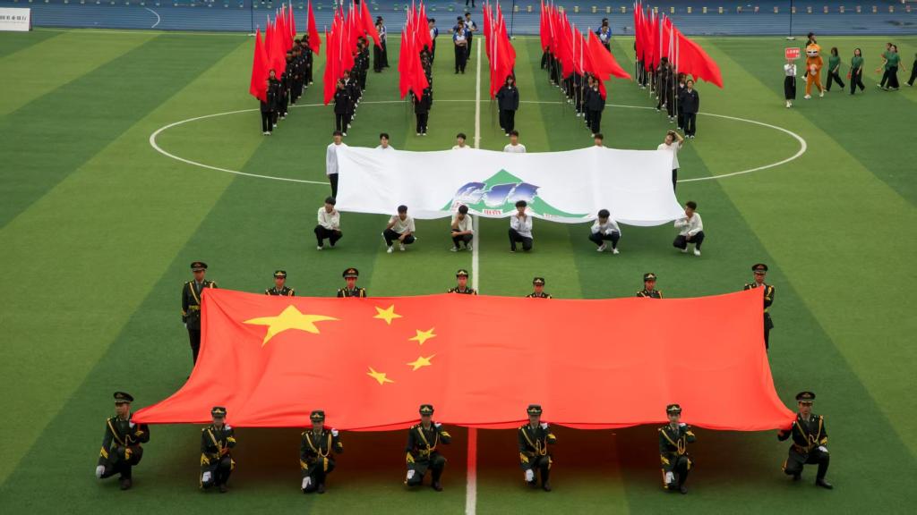 入场仪式结束后,全体起立,高唱中华人民共和国国歌,雄壮的歌声响彻运动场上空。